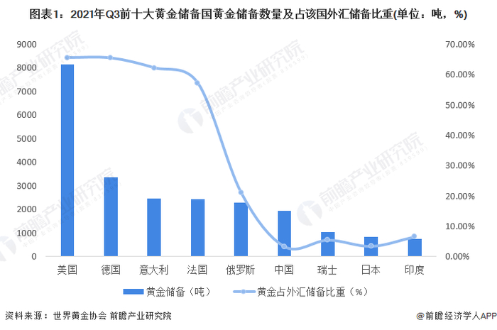 从各国黄金储备来看,根据世界黄金协会数据显示,截至2021年前三季度,美国是全球最大的黄金储备国,其黄金储备数量达8133吨以上,占其外汇储备的65.55%,其次为德国、意大利和法国。我国黄金储备则为1948.31吨,占我国外汇储备的3.24%,远低于前几大国家的水平。
