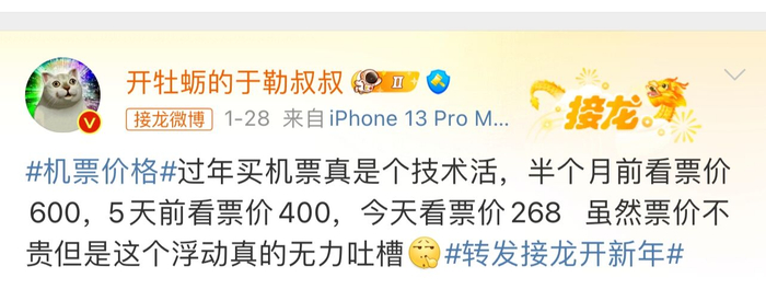 也有的旅客抱怨,越早入手机票反而亏得越多:“每次买完机票和赌博似的,一天之内亏了1000”、“过年买机票是个技术活,半个月前票价600,5天前看400,虽然票价不贵但是这个浮动真的无力吐槽”、“为啥前两个星期买的机票比现在贵一倍?”