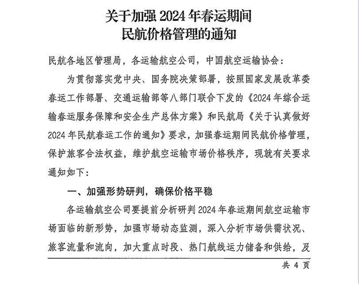 界面新闻从某民营航司获悉,1月22日民航局下发《关于加强2024年春运期间民航价格管理的通知》。通知中提到,各运输航空公司要制定合理的价格和销售策略,有效引导市场预期,充分满足旅客航空出行需求,确保航空运输市场价格平稳、竞争公平有序。