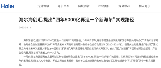 2020年3月,海尔集团召开会议,提出了“4年5000亿目标,再造一个新海尔”的目标。