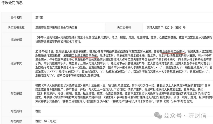 据“深环大鹏罚字[2019]第001号”,尚一智能因为“偷排工业废水”被深圳市生态环境局处以罚款50.00万元。据“深环大鹏罚字[2019]第002号”,尚一智能还因为“新增的客户展示中心未经环保审批擅自从事非标自动化设备和智能设备的研发”而被罚款11.00万元。