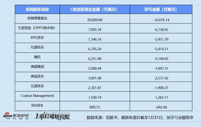 据招股书披露,Keep在上市前共完成了9轮融资,A轮至F-1轮的融资成本分别为每股0.13美元、0.28美元、0.62美元、0.70美元、2.06美元、2.42美元、4.10美元和5.19美元。如果基于当前汇率折算,Keep每股价格低至0.64美元,高盛集团、Coatue Management、腾讯投资、高瓴资本、软银愿景基金等多家C轮后参投的明星机构均已浮亏。其中,前三名软银愿景基金、天进贸易和时代资本累计浮亏2.85亿美元,占比接近六成。