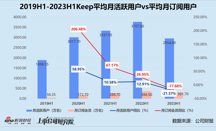 此外,作为互联网平台,Keep流量增长疲软,活跃用户数走低。截至2023年6月30日,平台平均月活跃用户约为2954.9万名,同比减少812.9万名,与2022年末相比减少208.9万名;平均月订阅用户约为301.7万名,同比下降17.68%,与2022年末相比下降7.71%。