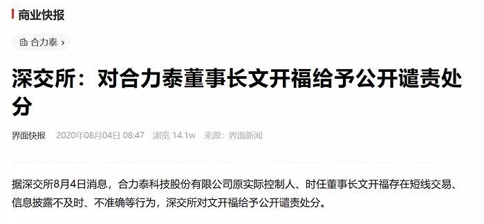 2020年8月4日,深交所披露了合力泰原实控人、时任董事长文开福存在短线交易、信息披露不及时、不准确等行为,对文开福给予公开谴责处分。2020年底,文开福持有合力泰股份比例从13.76%下降至8.32%,持股数量减少约1.7亿股。