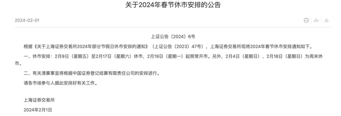 上交所关于2024年春节休市安排的公告