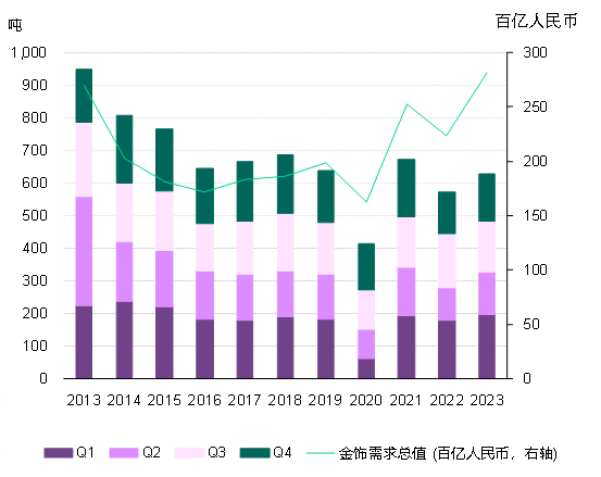 2023年中国国内金饰需求以及总金额图表来源:世界黄金协会