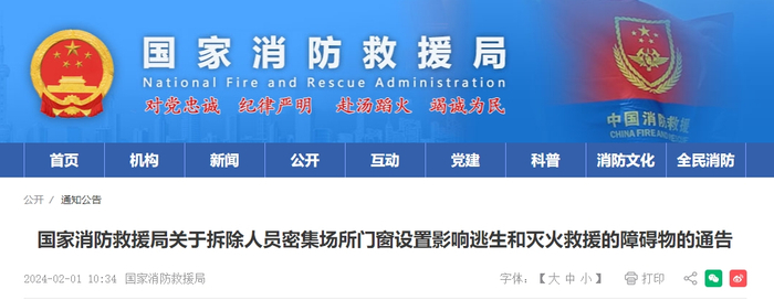 国家消防救援局关于拆除人员密集场所门窗设置影响逃生和灭火救援的障碍物的通告
