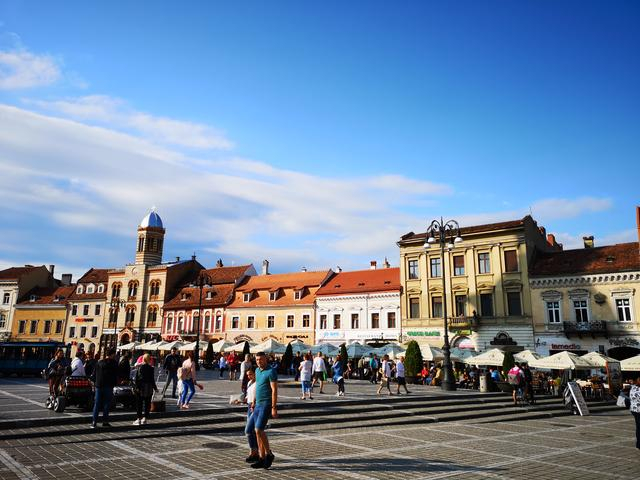 郊野与市区的距离是如此之近,以至于我正在感叹步行出城野游的惬意时,车子已将我带到一条繁华商业街。这里已经是布拉索夫老城中心,也是游客聚集地。各种风格建筑比邻而立,整体观感更像德国。