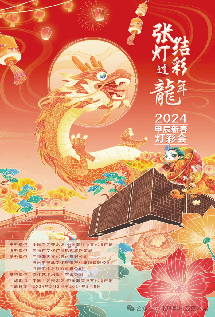 “张灯结彩过龙年”2024甲辰新春灯彩会上,可以欣赏到来自四川省自贡地区的五光十色的特色灯彩艺术,包括龙年生肖、《山海经》、自贡恐龙等创意灯彩主题作品,领略到自贡传统彩灯工艺和创新工艺相结合的独特魅力,沉浸式体验《山海经》中上古传说里“神兽”的奇幻世界,并通过彩灯了解相关科普知识。公众可关注“中国工美馆 中国非遗馆”公众号预约购票。