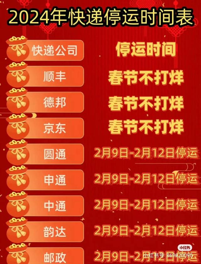 2月1日下午,话题#快递停运时间#冲上热搜,今日阅读量已突破1亿次。一张“2024年快递停运时间表”显示,除顺丰、德邦、京东3家快递公司“春节不打烊”外,圆通、中通、申通、韵达、邮政几家快递公司均在2月9日—2月12日 期间停运。