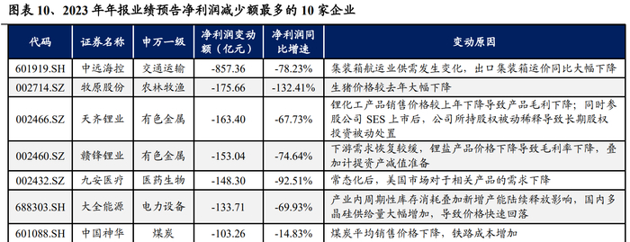 从个股来看,2023年年报业绩预告净利润增加额最多的10家公司中4家分布于交通运输行业,主要受益于国内经济复苏、消费者出行能力和意愿修复;另外还有2家来自新能源板块,其余则平均分布在农林牧渔、地产、公用事业和商贸零售行业。而2023年年报业绩预告净利润减少额最多的10家公司中有4家分布于新能源上游板块(锂矿&硅料),主要是受产能过剩,供需失衡,主要产品价格下跌影响;还有2家来自房地产板块,地产基本面仍然相对承压。