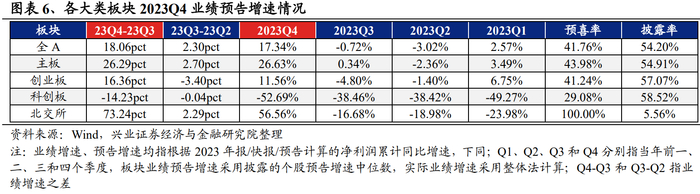 据2023年年报业绩预告,全A业绩增速较Q3显著回升[1]。从已经披露了业绩预告的公司来看,以2022年为基准,全A 2023年年报业绩增速中位数为17.34%,较2023Q3上行18.06个百分点。其中主板/创业板/科创板的业绩增速中位数分别为26.63%/11.56%/-52.69%,分别较2023 Q3提高26.29/16.36/-14.23个百分点。