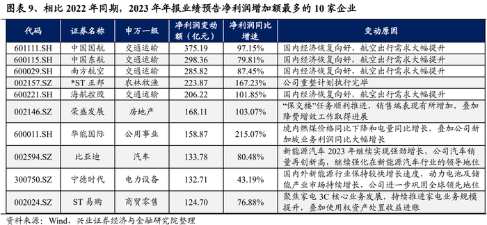 三、个股情况:四大航净利润预增规模居前,新能源上游和房地产预亏较多