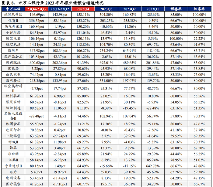 从23年报业绩预告同比增速来看,30个申万一级行业中(剔除综合行业,下同)共有21个行业实现业绩同比增长,其中社会服务(100.09%)、美容护理(90.65%)、纺织服饰(80.79%)、汽车(59.41%)和食品饮料(58.00%)等行业增速居前;旅游及景区、体育、油气开采、个护用品、航空机场、商用车、农产品加工、影视院线、化妆品和白色家电等细分行业净利润增速居前且实际披露率不低于50%。