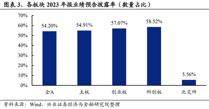 根据交易所最新关于业绩预告的披露规则,目前上市公司有条件披露年度业绩预告。截至2024年1月31日10时,A股整体5022家上市公司中(剔除上市一年之内的公司,下同),共2728家上市公司发布了2023年报业绩预告/快报/年报,其中实际公布业绩2722家,实际披露率为54.20%。其中主板3138家上市公司有1723家披露,披露率(数量占比)为54.91%;创业板1223家上市公司有698家披露完毕,披露率57.07%;科创板499家公司有292家披露,披露率为58.52%;北交所162家公司仅9家披露,披露率为5.56%。