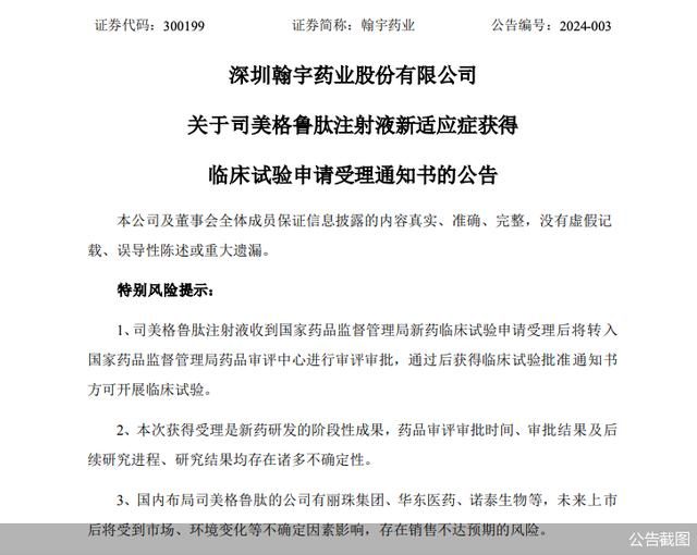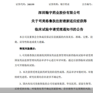 2月1日,翰宇药业公告称,公司收到国家药监局核准签发关于司美格鲁肽注射液临床试验申请的《受理通知书》。该药品适应症:作为低热量饮食和增加体力活动的辅助治疗,用于肥胖,或超重且伴有至少1种体重相关合并症的成人患者体重管理。