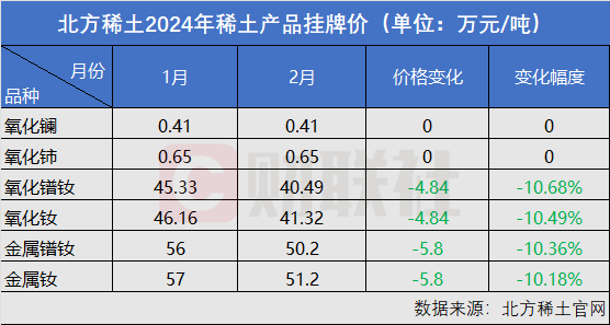 今日晚间,北方稀土2月份稀土产品挂牌价出炉,多个#### 稀土产品价格环比出现两位数以上跌幅。其中,氧化镧、氧化铈价格保持不变;氧化镨钕价格报40.49万元/吨,较1月环比下跌10.68%;氧化钕报41.32万元/吨,较1月下跌10.49%;金属镨钕报50.2万元/吨,较1月下跌10.36%;金属钕报51.2万元/吨,较1月下跌10.18%。
