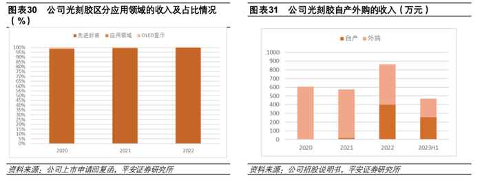 2023年上半年,公司自研光刻胶实现销售收入为255.34万元,占全部光刻胶收入的54.52%。根据在手订单、已通过认证的客户需求以及新客户的测试认证进度综合测算,公司预计2023年先进封装用g/i线负性光刻胶的销售收入在2000-3000万元。
