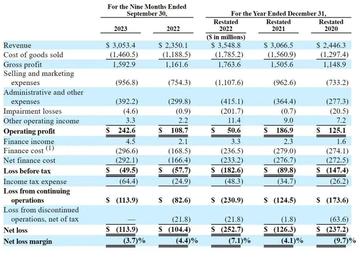 我们可从招股书略窥一二。2020年-2022年,亚玛芬体育营收分别为24.46亿美元、30.67亿美元、35.49亿美元;对应运营利润分别为1.25亿美元、1.87亿美元、5060万美元。2023年前9个月,其营收为30.53亿美元,运营利润2.43亿美元——与此形成鲜明对比的是,2019年,亚玛芬体育还是一家亏损经营的公司。