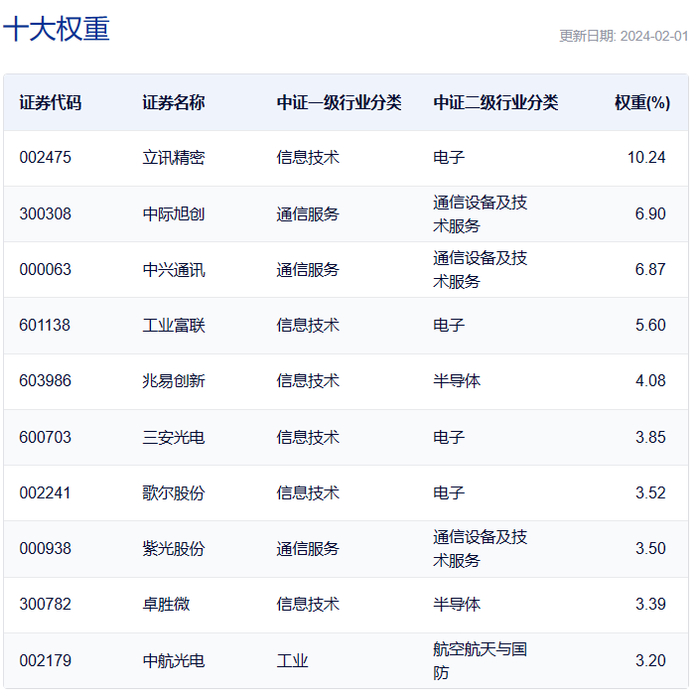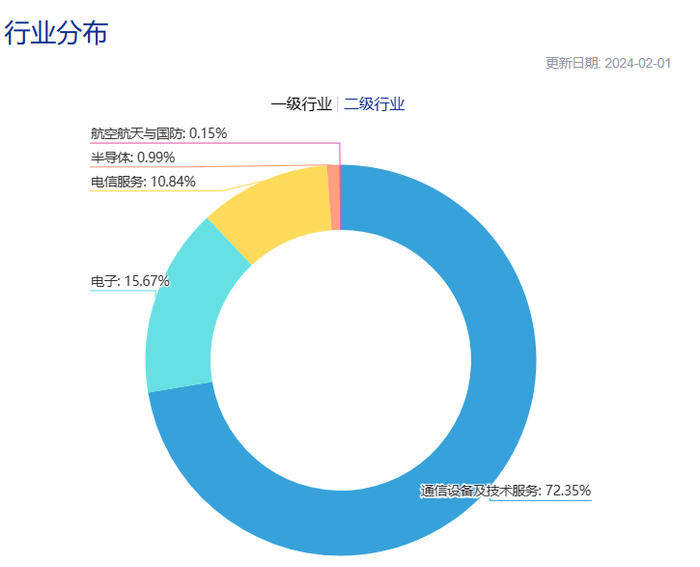进一步从行业分布来看,该指数成分股主要由三大行业构成,其中通信设备及技术服务行业占比达72.35%,电子行业占比15.67%,电信服务行业占比10.84%。