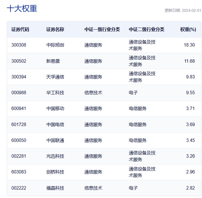 资料显示,中证光通信主题指数于2023年10月底发布,成份股共有50只,主要涉及光模块及元器件生产、光纤光缆制造、数据中心及电信运营领域的上市公司。