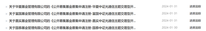 近日,记者从证监会的审批进度公示情况了解到,华夏基金、富国基金、嘉实基金、国泰基金均上报了一只光通信主题的ETF。