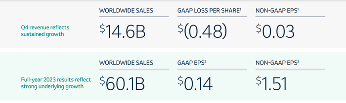 全年而言,公司实现营收601亿美元,GAAP规则下每股收益0.14美元,经调整后每股收益为1.51美元。