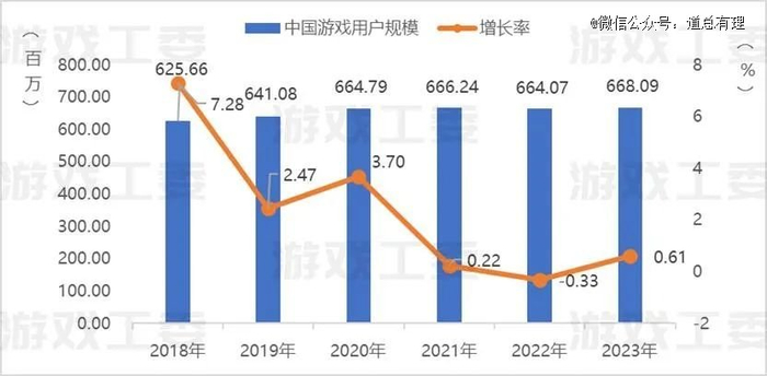 游戏市场规模的放缓,背后是用户规模的天花板。根据统计,我国游戏用户规模自2016年以来增速一直较慢,但2019年增幅高达22.25%,规模一下子升到6.44亿人,而这个数字似乎就已接近国内游戏玩家的“极限”。2022年,游戏用户规模为6.64亿,同比下降0.33%,2023年,游戏用户规模为6.68亿人,尽管恢复增长了,也仅仅增长了0.61%。