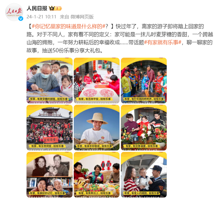值得注意的是,今年的“有家就有乐事”,更加聚焦小家之间的故事和消费者“乐在一起”——乐事薯片和《人民日报》一起在微博发起征集活动,号召粉丝图文分享自己的春节故事。借助媒体扩散助力,实现一场全民互动的新春龙年团聚预热。据悉,活动一经发布就引起了强烈反响。数据显示,截至2月1日,#有家就有乐事#微博话题总阅读量超6.2亿,互动量和讨论量分别达到298.9万和131.5万。