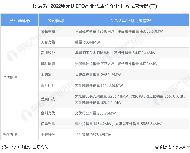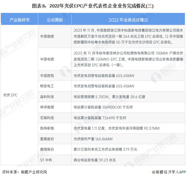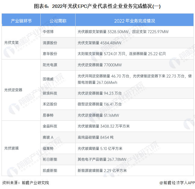 由于光伏EPC产业链涉及产品众多,统计口径有所区别,总体而言,光伏EPC产业链相关的代表性企业在2022年均实现了规模化生产与销售。