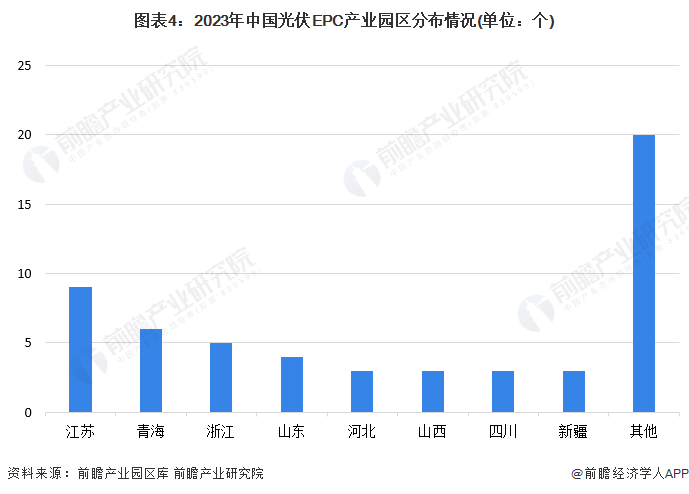 由于光伏EPC作为建造模式依旧主要依托于我国光伏产业链进行发展,因此前瞻采用我国光伏产业园区的分布情况间接进行光伏EPC产业园区的归纳总结。具体来看,我国当前共有56个行业相关的产业园区,其中江苏省光伏EPC行业相关产业园分布较多,其次是青海、浙江及山东。总体来看,我国光伏产业园区通常建设于产业链布局较为完善的地区,或是太阳能资源更为丰富的地区。
