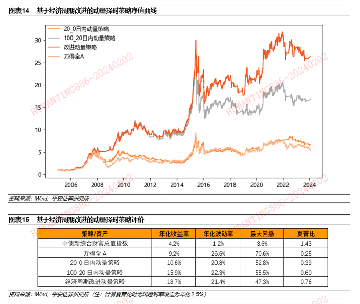 基于经济周期改进的动量策略:在信用下行+通胀下行阶段使用回望期20日的日内动量,在其余阶段使用回望期100日剔除期20日的日内动量。接下来我们通过数据来验证我们的推测:选定万得全A指数、中债新综合财富总值指数作为标的资产,通过经济周期划分构建时序动量改进策略。在一般情况下,我们使用回望期100交易日、剔除期20交易日的日内动量进行万得全A择时。但在信用下行+通胀下行阶段,使用回望期20交易日、无剔除期的日内动量进行万得全A择时。信用、通胀的上下行分别通过私人部门融资增速、0.3*PPI同比+0.8*CPI同比变动趋势来确定:当私人部门融资增速近1月均值大于3月均值则认为进入信用上行阶段,否则进入信用下行阶段;当0.3*PPI同比+0.8*CPI同比近3月均值大于6月均值则认为进入通胀上行阶段,否则进入通胀下行阶段。在万得全A动量因子大于0时,全仓配置万得全A,否则全仓配置中债新综合财富总值指数。选择2005年以来数据进行策略回测,数据截至2024年1月22日,月底调仓,设定双边买卖费率千分之一。