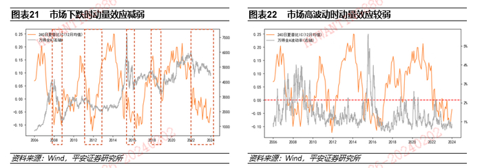 截面动量有效性存在显著波动,在市场下跌以及市场高波动时期,动量效应减弱。通过动量因子IC可以看出,截面动量择券的有效性存在显著波动,将会影响动量策略收益表现。历史研究发现,在熊市之后动量往往更容易失效,这种现象在A股市场同样存在。可以看到在过去5轮较大的熊市期间,回望期240个交易日夏普比动量的近12个月IC均值显著偏低,动量效应明显减弱。我们可以从交易行为的角度解释这一现象,在熊市时投资者行为会更加谨慎,追涨杀跌行为的减少可能是动量效应暂时失效的原因之一。同样,在市场高波动时期,动量因子也会失效。以万得全A近22日收益率标准差代表市场波动,可以看到在市场波动率显著偏高的2007-2008、2015年,动量因子IC显著偏低。