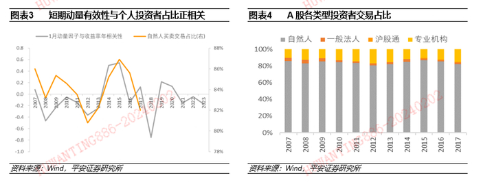 时序动量效应的成因与投资者结构相关,短期动量有效性与个人投资者占比正相关,个人投资者的信息劣势以及追涨杀跌行为可能是动量效应的成因。从A股市场时序数据来看,短期动量有效性与个人投资者交易占比成正相关。从截面数据来看,相较于美股、港股等成熟市场,A股市场个人投资者占比显著偏高,这可能解释了动量因子在万得全A上的择时效果更佳。动量效应的成因复杂,基于行为金融学的一种解释在于:个人投资者相对而言处于信息劣势且更容易追涨杀跌,具备信息优势投资者的交易行为使得部分信息已经反映在股价中,此时个人投资者关注到信息的滞后性、或者根据股价变动追涨杀跌的行为会使得市场行情延续。(交易结构数据由上海证券交易所公布,截至2017年。)
