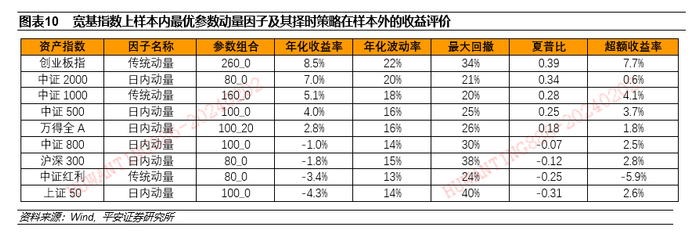 检验A股主要宽基指数的时序动量效应:多数指数上日内动量表现更好,择时策略回望期在4-5个月居多,一般不需要剔除期。样本内最佳因子在样本外表现普遍不错,时序动量对成长、小盘的择时收益更好。根据因子实证方案通过单资产择时策略检验宽基指数上的时序动量效应:在样本内对各因子进行调参、比较不同因子表现,选出样本内最优动量因子,并回测其在样本外收益表现。从样本内筛选结果来看:相较于传统动量,日内动量在多数宽基指数上表现更优;多数指数动量的回望期在4-5个月,创业板指数、中证1000的回望期较长,分别在13个月、8个月左右;除万得全A外,大多数指数的时序动量不需要剔除近期表现。从样本外回测结果来看:除中证红利指数外,其余指数上的择时策略均获得了一定超额收益;动量因子在创业板指、中证1000、中证500上的择时效果更好,年化超额收益率分别达到了7.7%、4.1%、3.7%。