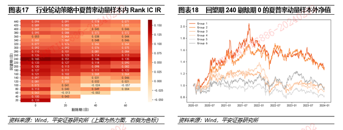 夏普率动量在样本外表现最好,样本内最优的参数为回望期240个交易日,2020年-2023年行业轮动策略年化收益率7%。样本内夏普率动量最优参数组合为(240,0),月度Rank IC IR为0.165,参数相对稳健。样本外不同动量大小的行业组合收益差异显著,在多头和空头组合均能获取一定收益,其中动量最高的前五行业构成的纯多头组合Group1年化收益率为7%。动量最低的后六个行业构成的组合Group6收益表现好于次低动量组合Group5,表明最低动量组合表现有一定程度反转,但整体上分组策略收益单调性显著。