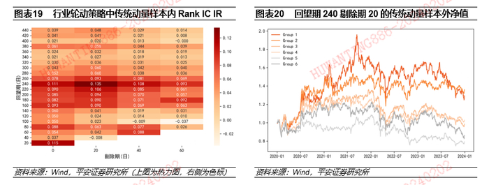 样本内最优的传统动量参数为回望期240个交易日、剔除期20个交易日,2020年-2023年以来行业轮动策略年化收益率6.7%。样本内传统动量最优参数组合为(240,20),月度Rank IC IR为0.135,参数相对稳健。样本外不同动量大小的行业组合收益差异显著,在多头和空头组合均能获取一定收益,其中动量最高的前五行业构成的纯多头组合Group1年化收益率为6.7%。
