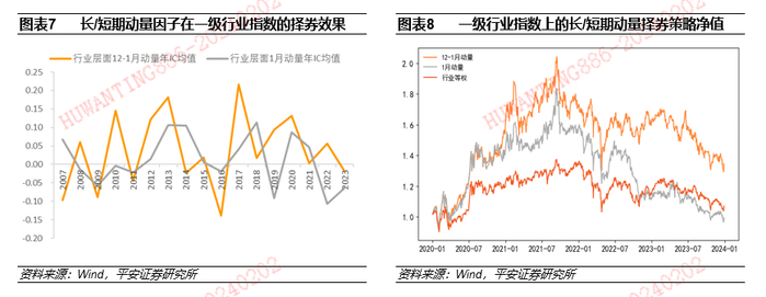截面动量可以应用于择券策略,在一级行业指数上,长期动量的择券效果强于短期动量。截面动量因子被用于资产择券,同样构建长、短期动量因子。通过2005年以来每月申万一级行业的长、短期动量大小与行业收益率的相关性计算各因子IC,因子IC越大代表动量效应越强。可以看到长、短期动量因子对申万一级行业均有一定择券效果,且长期动量的择券效果更好。当然,长、短动量的择券收益均不稳定,对动量因子的改进及适用环境的研究也是提高择券效果的关键。