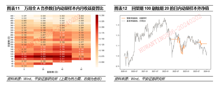 万得全A具有显著的日内动量,时间窗口为回望期100交易日,剔除期20交易日。对于A股市场宽基指数,以万得全A为例,在训练集上时间窗口为(100,20)的日内动量因子夏普比最高。回望期选择对策略样本内表现影响较大,回望期在80-120交易日、剔除期在0-40交易日范围的动量因子样本内夏普均不错。在测试集上,该因子信号变动频率较低,策略年化收益率2.8%。(图表中对参数-优化目标矩阵的参数展示范围大于调参范围,仅为更直观、全面地展示优化目标的变化情况,调参范围以实证方案为准。)