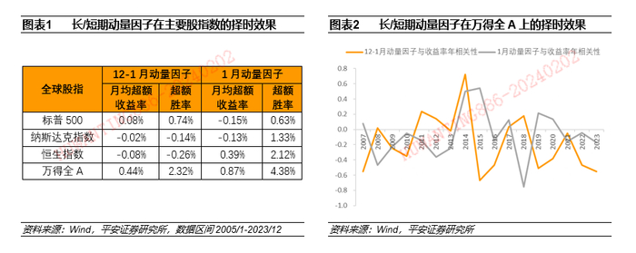 时序动量可以应用于资产择时,A股市场时序动量效应强于美股、港股市场。在A股,短期动量的择时效果强于长期动量。时序动量因子被用于资产择时,以过去一年剔除近一个月累计收益率、过去一个月累计收益率分别代表长、短期动量因子。通过2005年以来长、短期动量对各指数月度收益的择时信号,测算动量因子看多月份指数月均收益率以及胜率的提升。可以看到长、短期动量因子对万得全A均有一定择时效果,且短期动量的择时效果更好。动量因子对A股市场择时的收益、胜率提升显著高于美股、港股市场。通过测算各年份动量因子与指数月收益率的相关性,可以看到长、短动量因子择时效果并不稳定,对动量因子的改进及适用环境的研究是提高择时效果的关键。