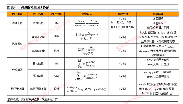 风险调整类动量因子:经由风险调整后的收益率,常见有夏普率和信息率。风险调整类动量因子是对传统动量的一种改进,它在考虑资产的历史表现趋势的同时,加入对风险的评估。现代投资组合理论已经证明,资产收益与其风险息息相关,因此风险调整类动量因子在评估资产表现时候会考虑波动性、市场敏感度等风险指标。其核心改进在于在追求高回报的同时,注重回报的稳定性和可持续性。因此,风险调整类动量因子提供了一种更为全面和均衡的投资决策,旨在实现在控制风险的同时获取超额收益。本文研究的夏普率和信息率因子,分别是基于标准差调整后的相对无风险利率超额收益率、基于标准差调整后的相对市场等权组合超额收益率。