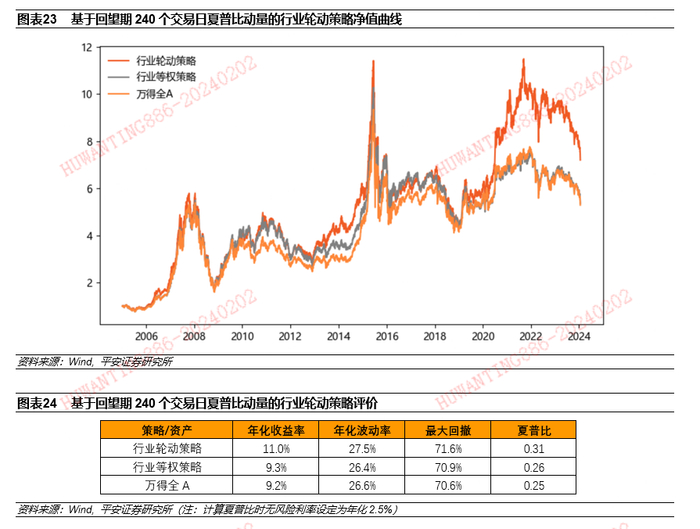 基于回望期240个交易日夏普比动量的行业轮动策略表现:相较于行业等权组合,策略超额年化收益率为1.7%,夏普比由0.26提升至0.31。2010年以来,在市场上行阶段基于动量的行业轮动策略表现相对较好。基于回望期240个交易日夏普比动量构建行业轮动策略:每月根据240日夏普比动量大小,筛选动量前十的行业构建投资组合。选择2005年以来数据进行策略回测,数据截至2024年1月22日,月底调仓,设定双边卖卖费率千分之一。在回测期间,行业等权策略与万得全A表现基本一致,行业轮动策略具有一定超额收益。2010年以来,在市场上行阶段行业轮动策略容易有超额,而市场下行阶段基于动量的行业轮动策略相对收益有所回调,结论与前期一致,通过市场状态的判断也有助于在合适时机选择相应策略。