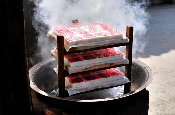 梁弄大糕用大米磨粉制作,填入豆沙馅再蒸熟,方方正正、白白净净的外形,配着红曲粉染色的正楷字体吉祥话,其制作技艺已被列入宁波市非物质文化遗产代表作名录。刚出炉的梁弄大糕热气腾腾,浓郁的米香、红豆的清甜在口腔中流动,不粘牙又不松散。
