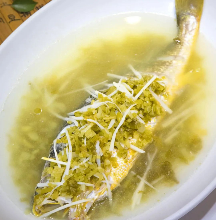 一条东海的野生大黄鱼遇到邱隘的雪里蕻,咸鲜合一、荤素搭配、汤浓味原,简直是天造地设的搭配。吃时先喝汤,再吃鱼肉,最后嘬骨头,吃得浑身热腾腾,是溢出来的温度和幸福感。