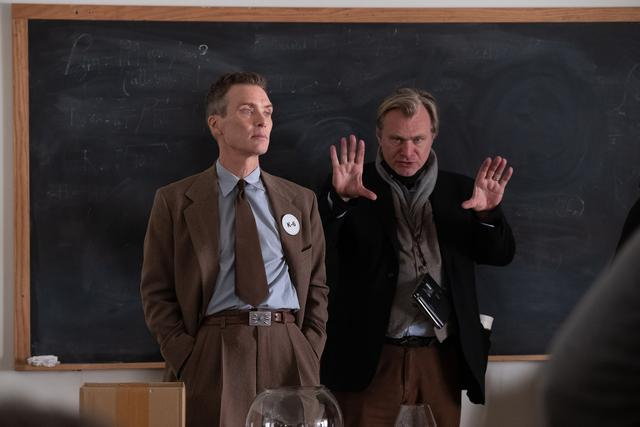 《奥本海默》主演基里安·墨菲(左)和导演克里斯托弗·诺兰在拍摄现场。
