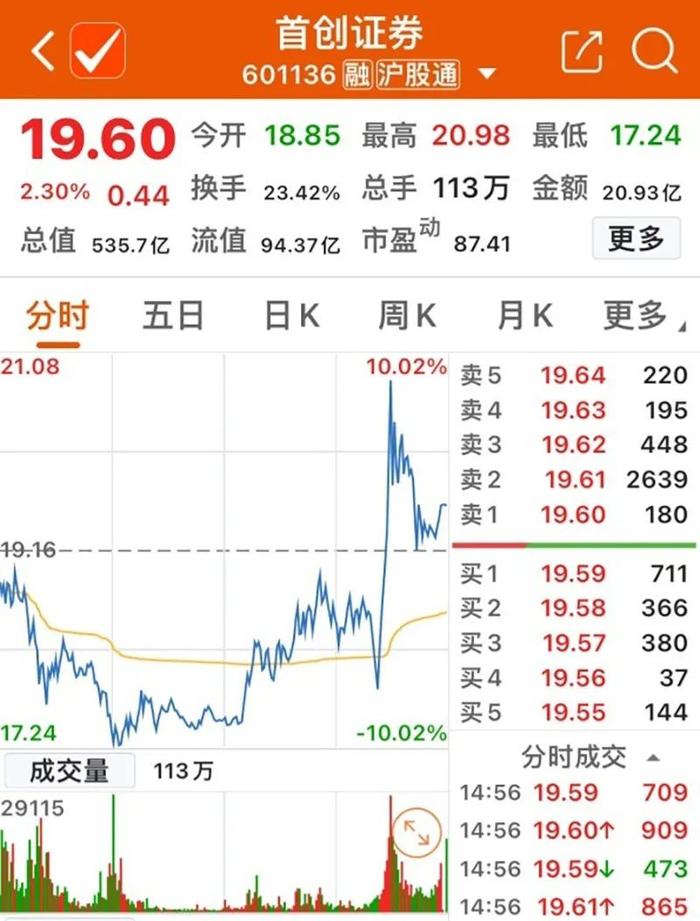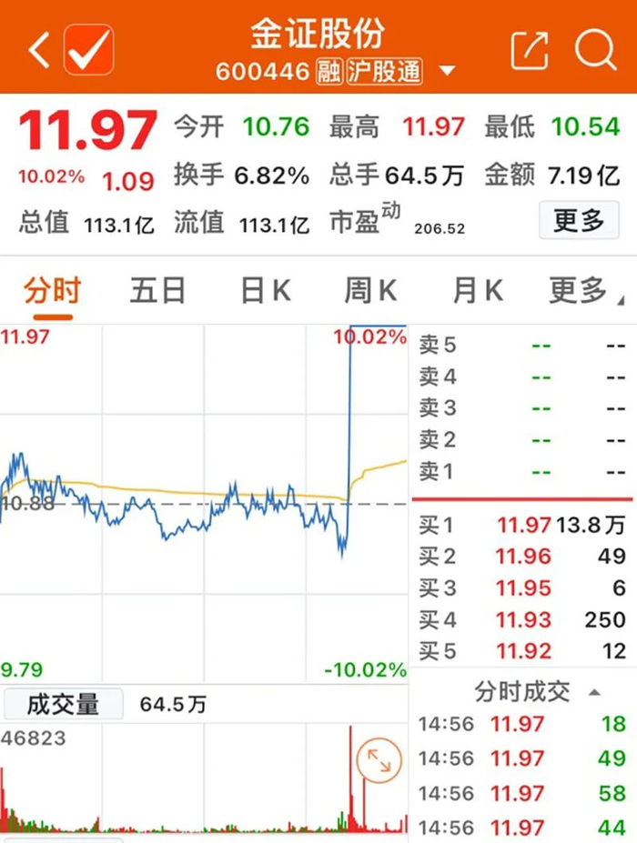 14时25分左右,A股市场开始上演反转走势,大金融板块一马当先。重点个股如金证股份直线拉起,股价不到两分钟暴涨近12%,并大单封死涨停。券商板块中,首创证券股价从下跌7%,10分钟内拉升至涨超9%,其他多只券商股也纷纷跟涨。