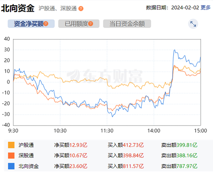 今日午后,北向资金一度净卖出超过30亿元,但在14时之后持续回流,14时20分净买入额陡升。截至收盘,北向资金全天净买入23.60亿元,其中沪股通净买入12.93亿元,深股通净买入10.67亿元。