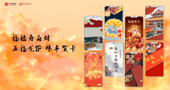 据统计,中国联通视频彩铃商用以来,已发展2.8亿用户,视频日播放量(DAV)超过3.5亿次,成为最大的移动互联网入口之一。在新的一年里,撷取“福禄寿喜财”的美好寓意,龙彩铃将化身祥瑞、鸿运、康泰、美事、聚财,凭借丰富模板和视频资源,为“龙的传人”带去龙年的美好吉祥,传播龙年好运。