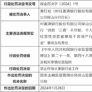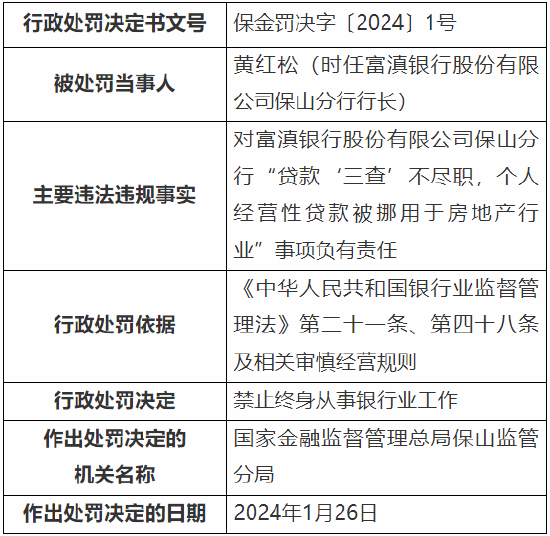 2月2日金融一线消息,国家金融监督管理总局保山监管分局行政处罚信息公开表显示,时任富滇银行股份有限公司保山分行行长黄红松对富滇银行股份有限公司保山分行“贷款‘三查’不尽职,个人经营性贷款被挪用于房地产行业”事项负有责任,被国家金融监督管理总局保山监管分局禁止终身从事银行业工作。