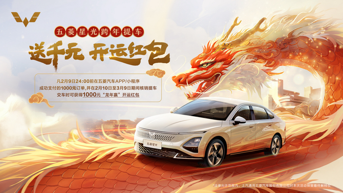 针对2024年2月9日24:00之前在五菱汽车APP或小程序成功支付的1000元订单、并在2月10日~3月9日之间提车的用户,交车时由经销商给用户发放1000元的“龙年赢”开运红包,补贴春节期间的通勤费用。
